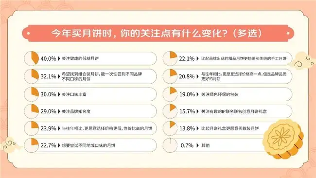 这份数据同样值得注意的是,32.1% 的消费者表示 「希望找到组合装月饼,一次品尝品牌不同口味的月饼」,足见消费者对购买品尝月饼的热情,以及对月饼 「多样化」 的新需求。