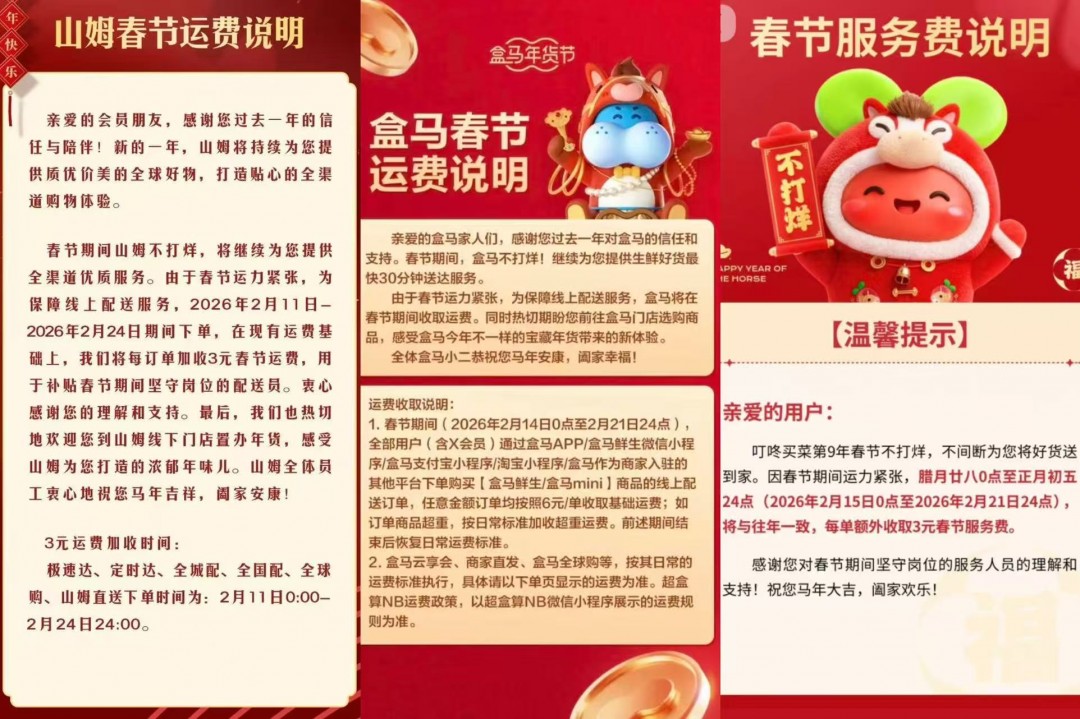 盒马公告称,春节期间 (2026 年 2 月 14 日 0 点至 2 月 21 日 24 点),全部用户 (含 X 会员) 通过线上配送订单,任意金额订单均按照 6 元/单收取基础运费;如订单商品超重,按日常标准加收超重运费。前述期间结束后恢复日常运费标准。