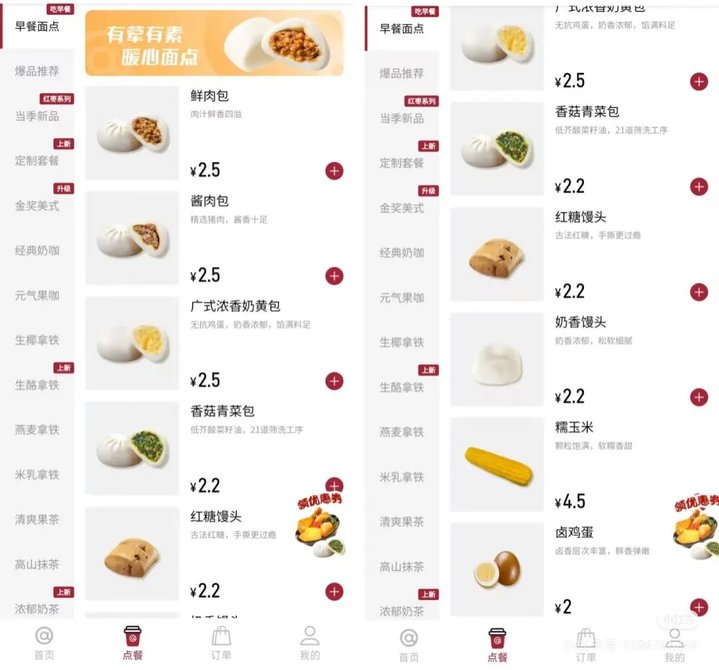 库迪是搞副业的最激进探索者,直接卖起了快餐和包子。2025 年初,库迪北京总部楼下的门店被发现开卖早餐面点和热食便当,SKU 接近 20 款,价格在 1.2 元-20.9 元之间。其中,鸡腿饭、狮子头饭、把子肉套餐等快餐定价在 13.9-14.9 元,和沙县小吃类似。