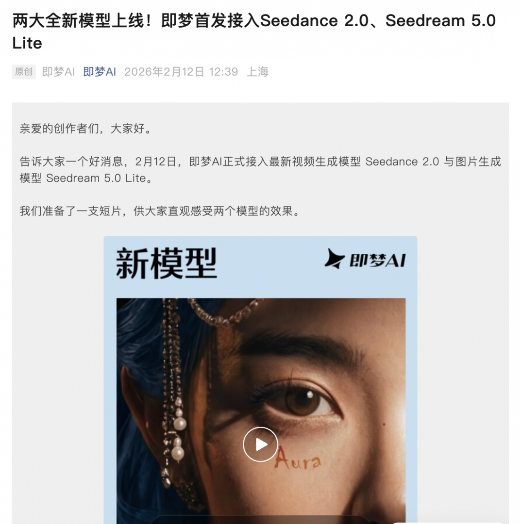【TechWeb】2 月 12 日消息,据即梦 AI 官微消息,今日,即梦 AI 正式接入最新视频生成模型 Seedance 2.0 与图片生成模型 Seedream 5.0 Lite。