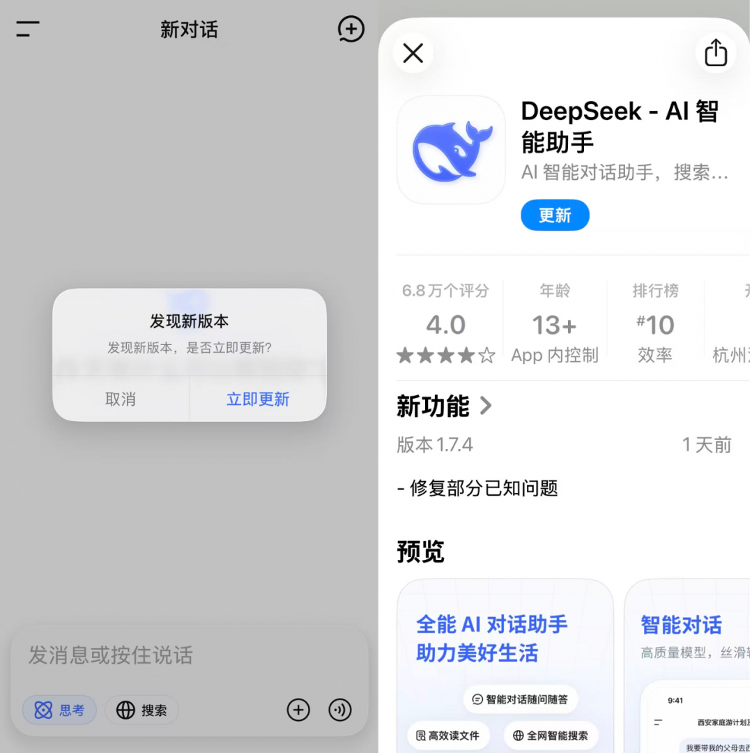 【TechWeb】2 月 12 日消息,临近春节,DeepSeek App 更新新版本至 1.7.4 版本,网页端也同步进行了更新。