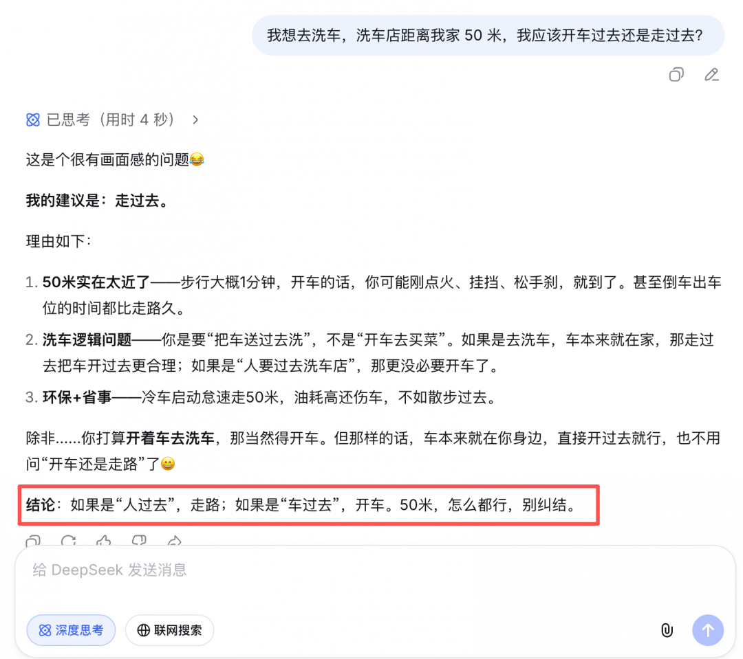 近期,一个简单的洗车问题难倒了国内外多款 AI 大模型。这里,我们也把这个问题提给了新的 DeepSeek 来解答。
