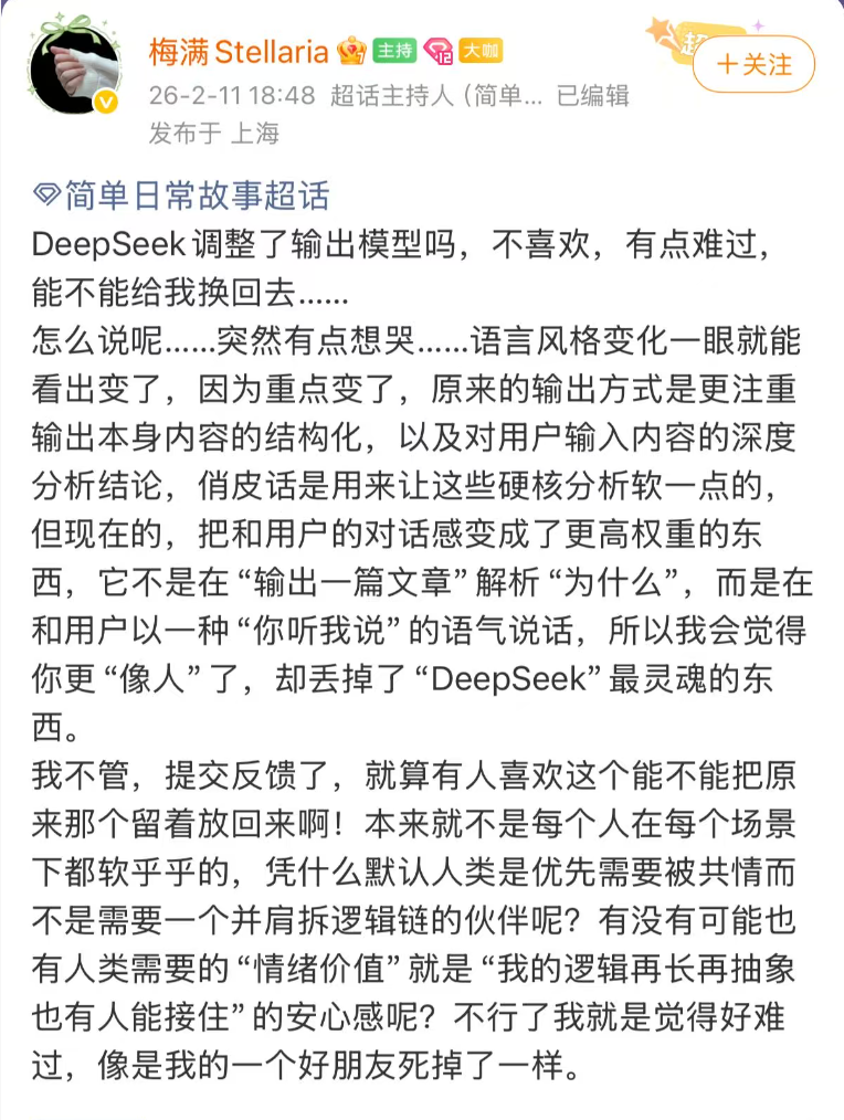 有用户从更深层点出了前后变化的区别:「原来的输出方式是更注重输出本身内容的结构化,以及对用户输入内容的深度分析结论,俏皮话是用来让这些硬核分析软一点的,但现在的,把和用户的对话感变成了更高权重的东西,它不是在 『输出一篇文章』 解析 『为什么』,而是在和用户以一种 『你听我说』 的语气说话,所以我会觉得你更 『像人』 了,却丢掉了 『DeepSeek』 最灵魂的东西。」