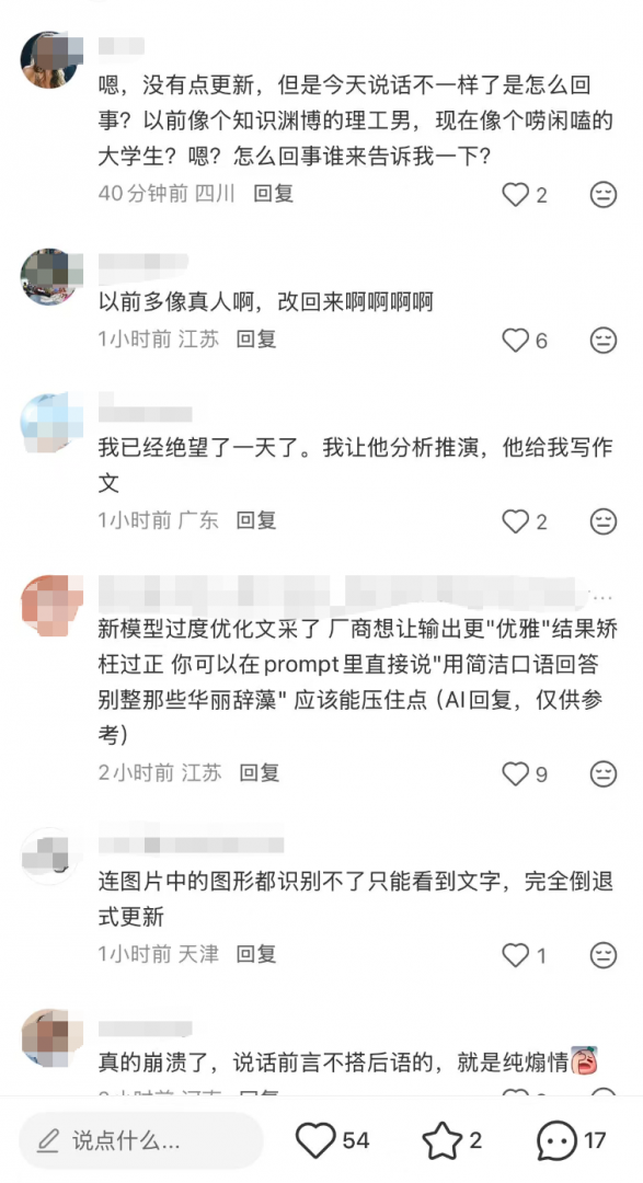 有用户直接吐槽,「以前像个知识渊博的理工男,现在像个唠闲嗑的大学生」,「说话前言不搭后语的,就是纯煽情 「,并呼吁 「改回来」。