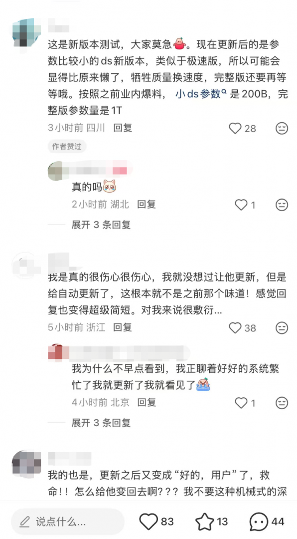 还有用户安慰大家,指出:「这是新版本测试,是参数比较小的新版本,类似于极速版,所以可能会显得比原来懒了,牺牲质量换速度,完整版还要再等等。按照之前业内爆料,小 ds 参数是 200B,完整版参数量是 1T。」