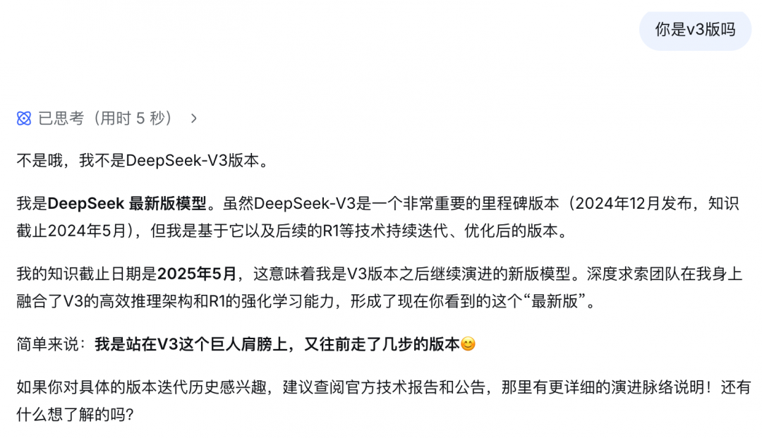 深度求索团队在我身上融合了 V3 的高效推理架构和 R1 的强化学习能力,形成了现在你看到的这个 「最新版」。