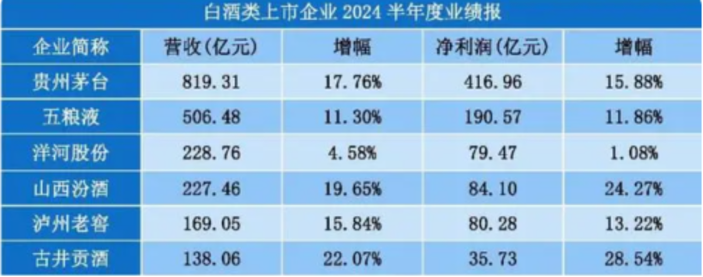 从基本面角度来看,首先是业绩增长层面,2024 上市白酒企业半年度业绩披露已经落幕,高端白酒企业之中,贵州茅台依旧保持了较为亮眼的业绩增长。