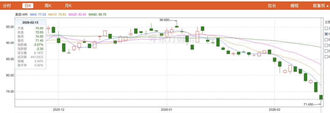 2 月 13 日,美团每股收报 72.65 港元,总市值正式跌破 5000 亿港元大关,报 4440 亿港元—— 这是自 2020 年以来的最低估值水平。