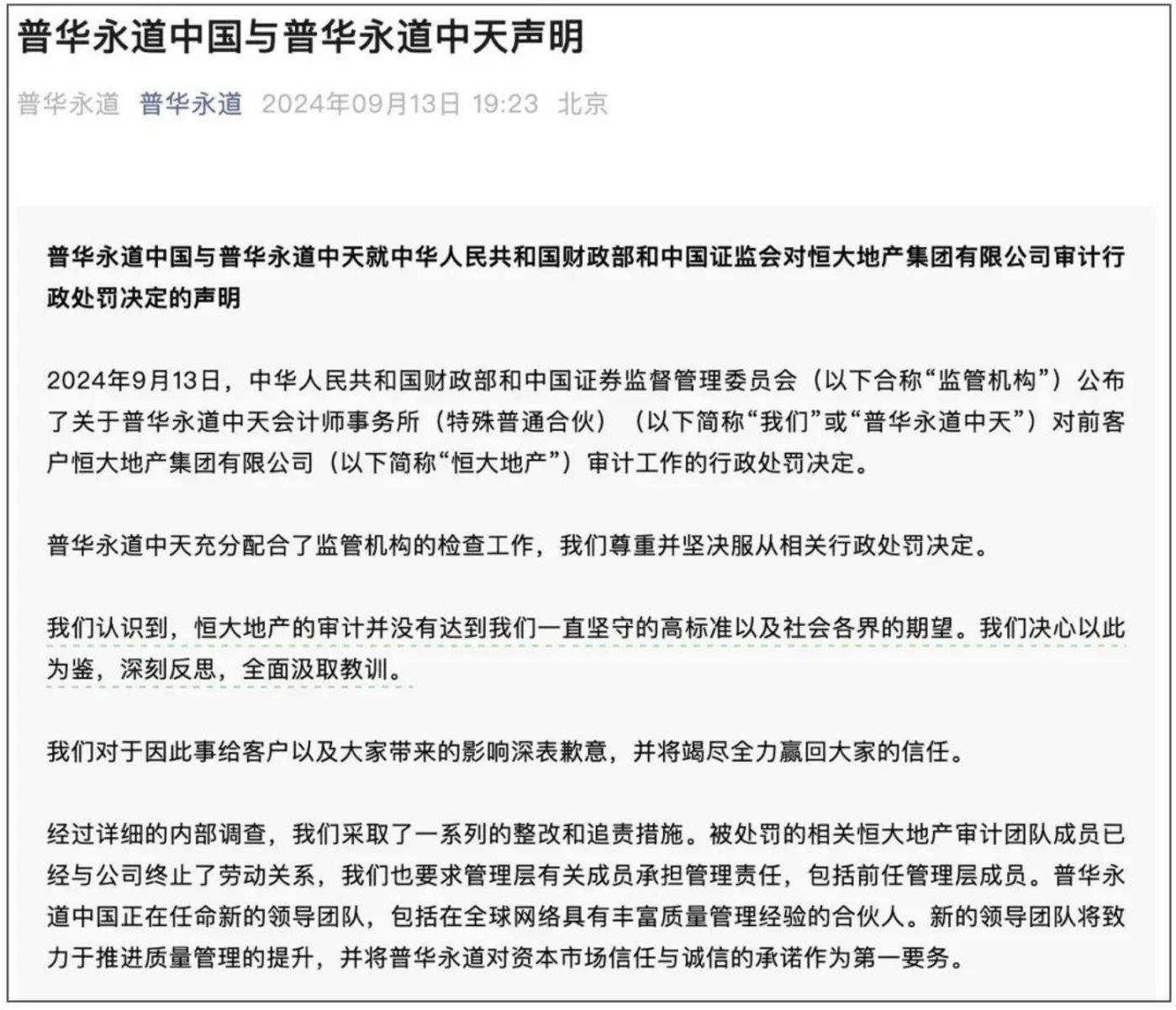声明中,普华永道表示,自己在对恒大地产的审计中,没有一直坚守的高标准以及社会各界的期望,公司决心以此为鉴,深刻反思,全面汲取教训,在 「尊重并坚决服从相关行政处罚决定」 的同时,也将 「竭尽全力赢回大家的信任」。