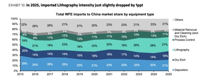 光刻机进口方面,2025 年全年进口额与 2024 年基本持平,仅同比下滑 1%,但 12 月光刻机进口额达 23 亿美元,创下月度历史纪录。(相关进口指标包括:沉积、干法刻蚀、光刻机、过程控制系统、材料去除与清洁、其他,以及对应总额和不含光刻的总额)
