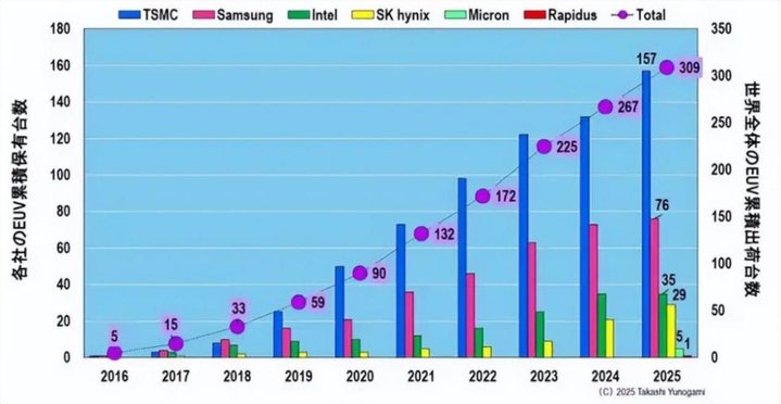自 ASML 在 2016 年正式量产 EUV 光刻机以来,这十年间全球累计交付的 EUV 设备约为 309 台。其中,台积电独占 157 台,占比高达 50.8%—— 全球一半的 EUV 产能都被这家中国台湾代工厂收入囊中。紧随其后的是三星,其工厂内部署了 76 台 EUV;Intel 则拥有 35 台,SK 海力士 29 台,美光 5 台,而 2022 年才成立的日本 Rapidus 公司,也拿到了 1 台 EUV 作为先进制程布局的起点。