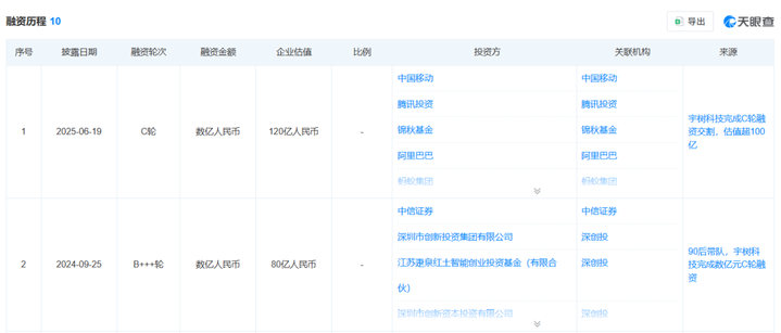 宇树科技已于 2025 年 11 月完成了 IPO 辅导,冲刺进入最后阶段,有望成为 A 股 「人形机器人第一股」。天眼查显示,目前宇树已经完成了 10 轮融资。最新一轮公开融资是去年 6 月,吸引了中国移动旗下基金、腾讯、锦秋基金、阿里巴巴、蚂蚁集团、吉利资本等投资方,彼时企业估值超过 100 亿元。