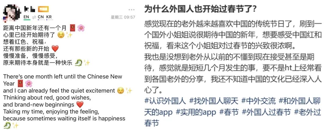 一位在 HelloTalk 上学习中文的美国网友就坦言:“ 我看到很多中国年轻人和我们一样爱喝咖啡、追剧、吐槽工作,但也保持着独特的家庭观念和生活仪式感—— 这让我很想亲自去看看。”