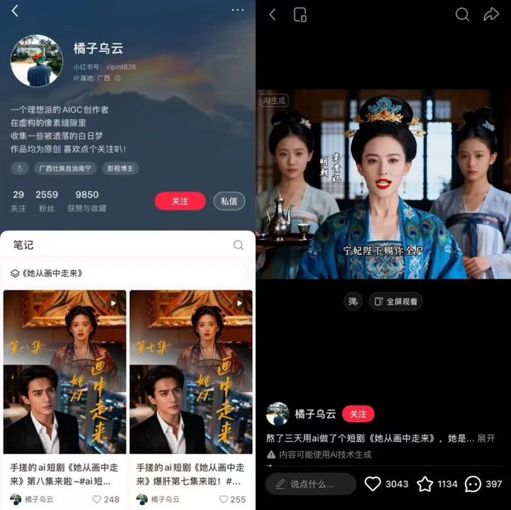 如小红书 @橘子乌云 25 年 11 月开始手搓短剧作品 《她从画中走来》,目前已发布八集,最高单集点赞数达 3000+,未来这样的创作者将越来越多。