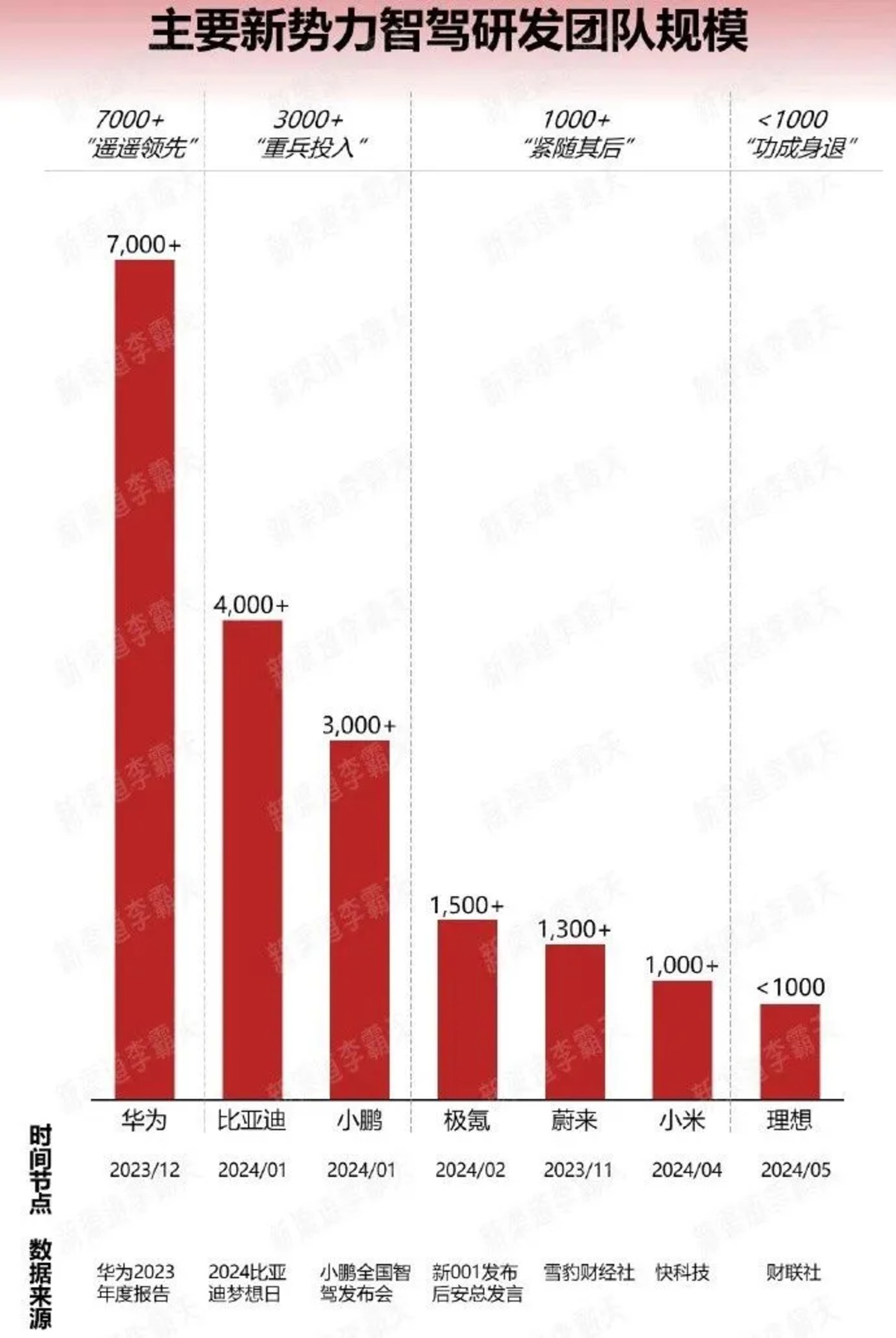 对此,有汽车博主曾做过相关情况统计:华为 (2023 年 12 月超 7000 人,不过这一数字应该是华为车 BU 总人数)、比亚迪 (2024 年第一季度超 4000 人)、小鹏汽车 (2024 年第一季度超 3000 人)、极氪汽车 (2024 年 2 月超 1500 人)、蔚来汽车 (2023 年 11 月超 1300 人)、理想汽车 (2024 年 5 月预计低于 1000 人)。