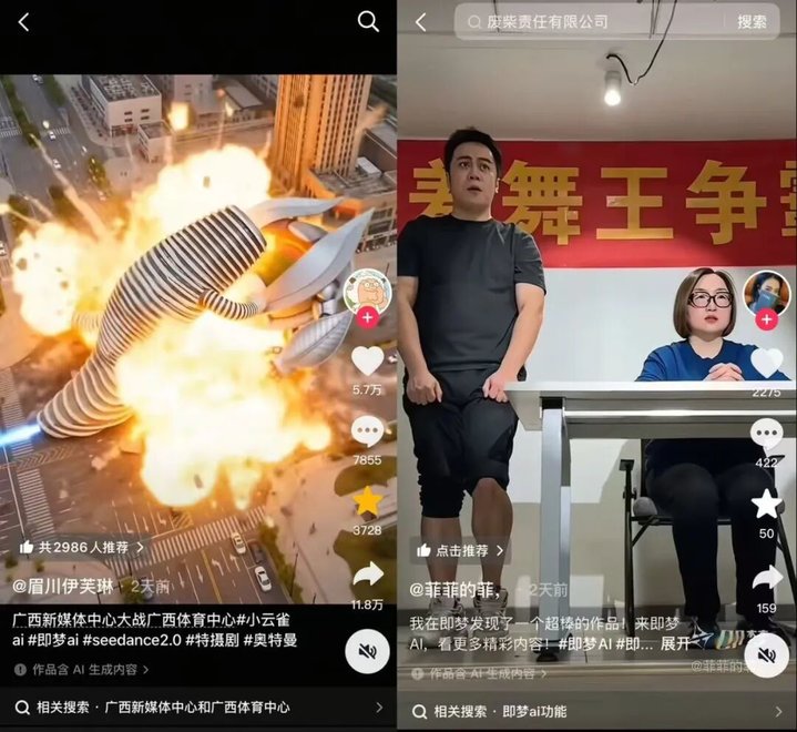 有两条 AI 视频作品让我个人感到相当震惊。一个是广西媒体中心大战广西体育中心,两栋建筑变身大怪兽,打出了一种哥斯拉大战蝎子莱莱的感觉。另一个是我经常会看的账号 @废柴责任有限公司,他们在 Seedance2.0 的刺激下好像完全放飞了自我,让一位员工的 AI 分身穿着短裤参加了辣眼睛的娇羞舞王争霸赛。