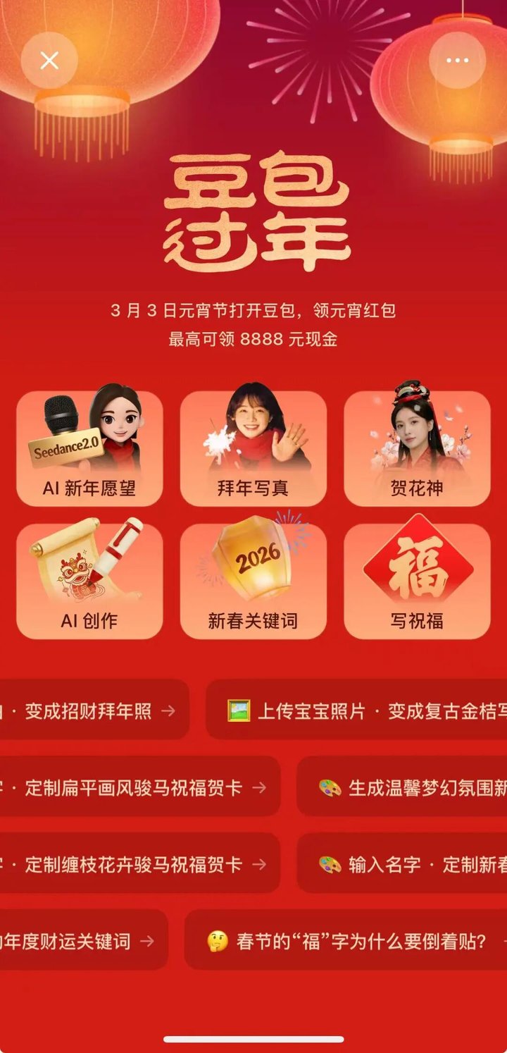 这种 C 端表达应该会主要依托豆包——抖音这个传播链路来实现。春晚通过三轮互动将大众的目光聚焦到了豆包上。「豆包过年」 活动中的 《贺花神》 模板、AI 新年愿望等互动则可能会开启更多人的 AI 视频创作历程。