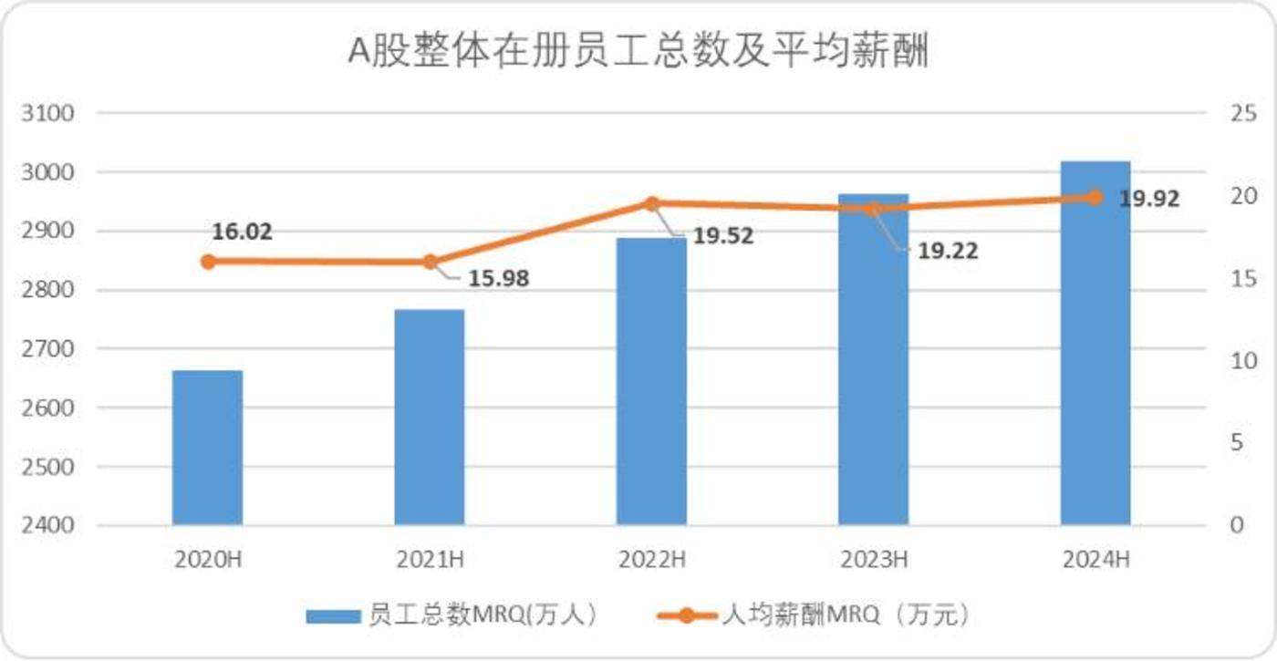 虽然近两年企业优化、裁员的新闻不断,但作为国内最优质的一批企业和稳定就业的蓄水池,同口径下 A 股企业在册员工数量还是处于稳中向好,节节攀升的态势,最新一期 (部分企业中报未披露,采用最近一次披露数值) 在册员工数量突破了 3000 万。
