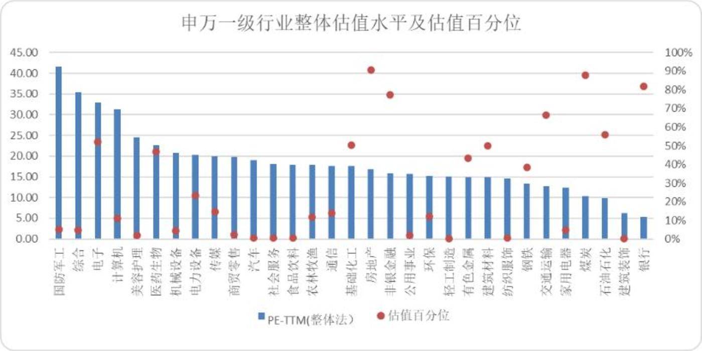图: 申万一级行业整体估值及百分位,来源: Choice 金融客户端,锦缎整理