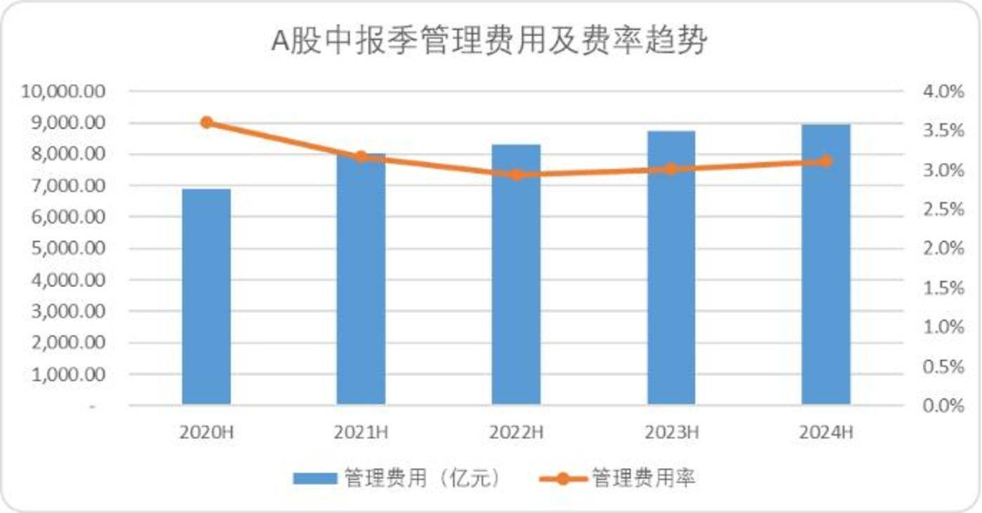 图: A 股中报季管理费用及费率趋势,来源: Choice 金融客户端,锦缎整理
