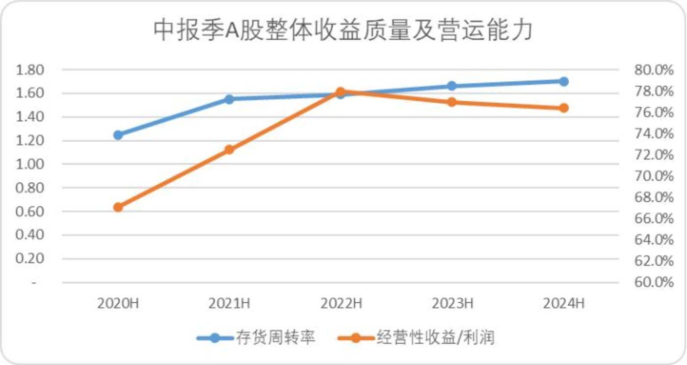 当然收入侧也并非都是 「坏」 消息,从今年中报季 A 股整体的收益质量来看,经营性收益占整体利润的比例维持了高水准,比例达到了 76.4%,五年间提升了大约 9pct。实打实的经营性收入占比提升。这也意味着当前市场上大多数标的 「营收水分」 被挤的相对干净,靠补贴和溢价并购带动营收成为了过去式。