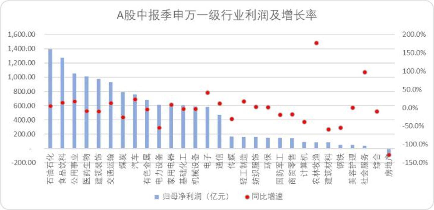 图: 中报季申万一级行业利润及增长率,来源: Choice 金融客户端,锦缎整理