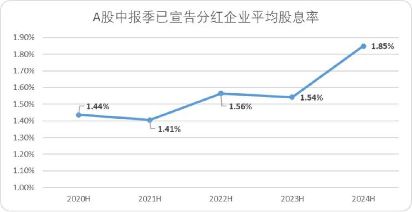 中报季整体现金储备下降的另一个因素是,国九条发布后,今年上半年 A 股宣告分红企业的股息率均值达到了 1.85%,同比提升了 0.3pct,远高于往年同期。