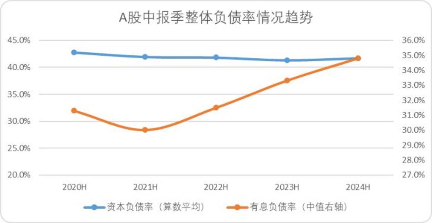 从负债率来看,A 股整体的负债率绝对值近五个中报期处于趋稳下滑的态势,今年上半年整体负债率同步微增 0.4pct,五年间整体下滑了约 1.1pct。