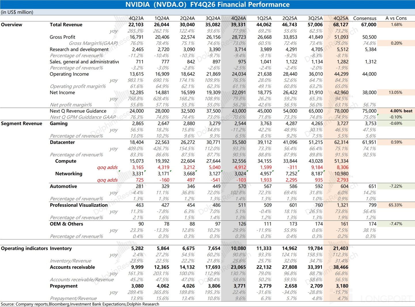 2.1 营业收入:2026 财年第四季度 (即 4Q25) 英伟达公司实现营收 681 亿美元,同比增长 73%,好于上调后的买方预期 (670 亿美元)。公司本季度环比增长的 110 亿美元,基本上都来自于数据中心业务及 Blackwell 系列量产爬坡的带动。