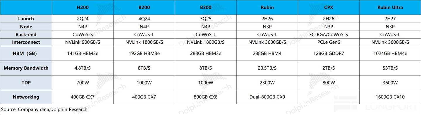 c)Rubin 新产品的进展:当前英伟达的主要产品是 B300 系列,而公司计划将在 2026 年下半年推出 Rubin 和 CPX 产品,届时将开始采用台积电 3nm 工艺,接着公司还将在 2027 年继续推出 Rubin Ultra 产品。