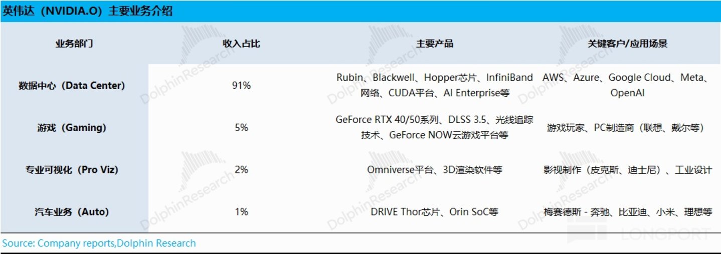 1) 数据中心业务:是当前最主要的关注点,其主要产品包括 Blackwell、Hopper 等算力芯片,公司的核心客户是亚马逊、微软、谷歌等云服务大厂;