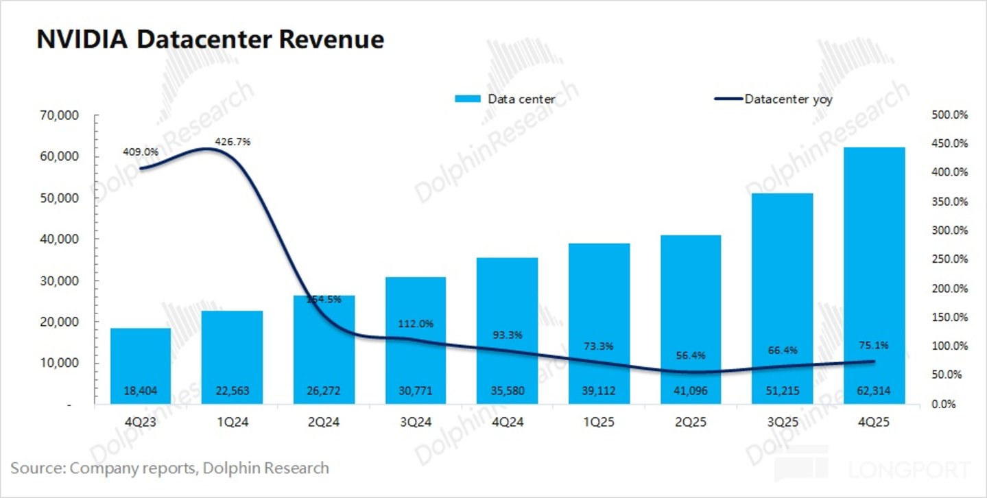 3.1 数据中心业务:2026 财年第四季度英伟达数据中心业务实现营收 623 亿美元,同比增长 75%。数据中心业务仍然是公司的最大关注点,本季度增长主要是由 Blackwell 系列产品量产增加的带动,其中受加速计算和人工智能的推动。
