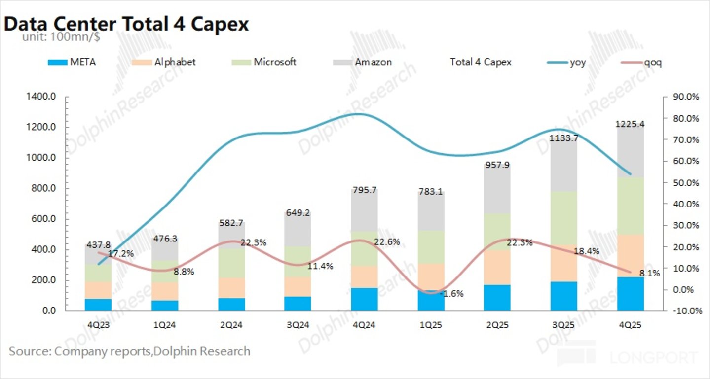 结合各家资本开支及展望,海豚君预计四大核心云厂商 (谷歌、Meta、微软和亚马逊) 在 2026 年的资本开支有望提升至 6600 亿美元以上,同比增长 62%。