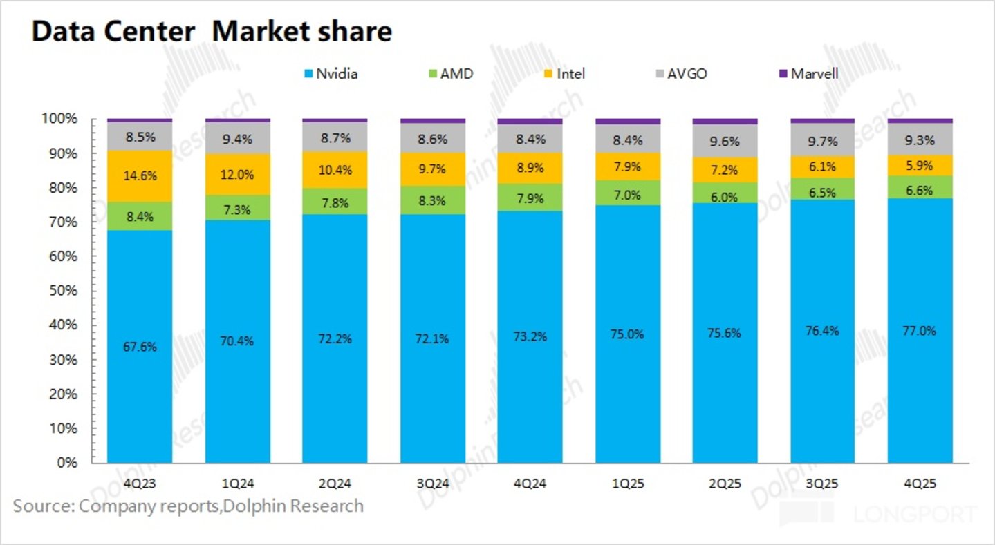 当前 「谷歌 Gemini+ 博通」 已经占据将近一成左右的市场份额,将逐渐对英伟达在 AI 市场上产生挑战,有可能进一步影响英伟达在 AI 芯片市场的份额及毛利率 (市场担心毛利率在 2026 年之后出现下滑)。