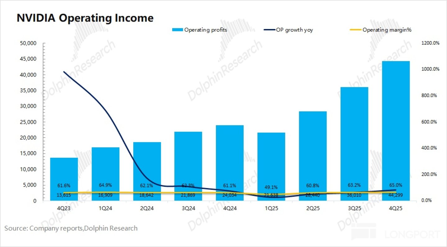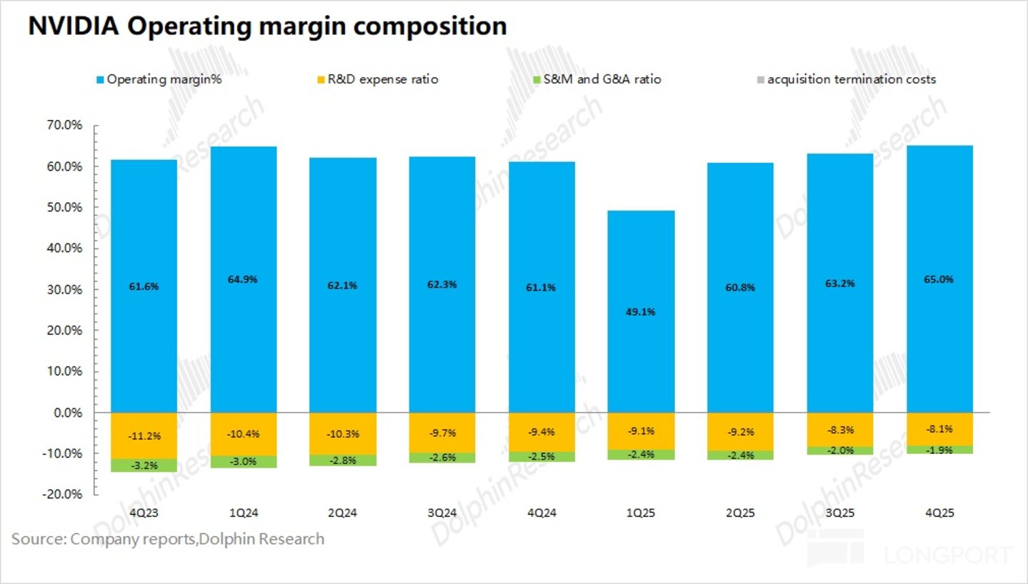 2026 财年第四季度英伟达核心经营利润率为 65%,继续提升,主要是受毛利率回升以及经营费用率下降的影响。