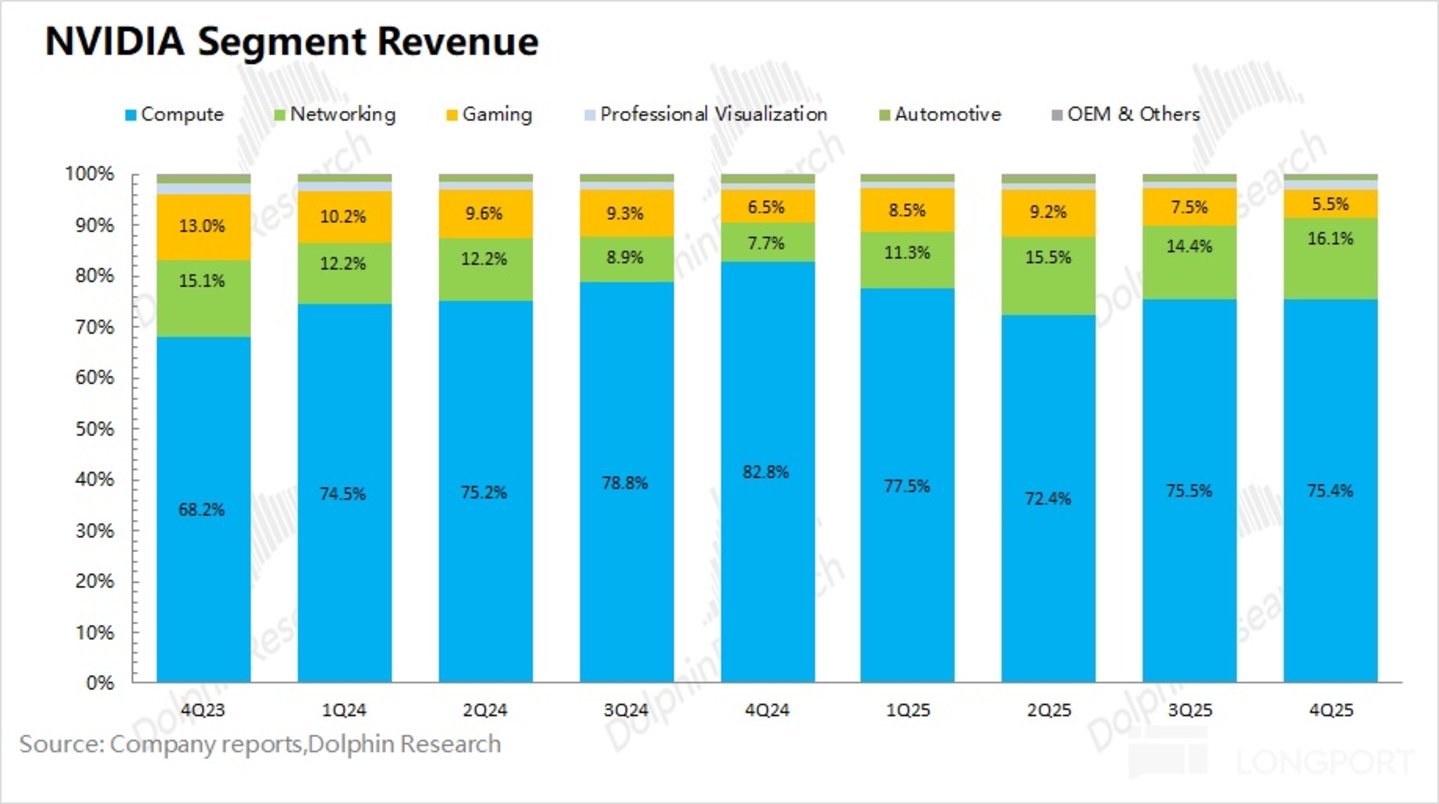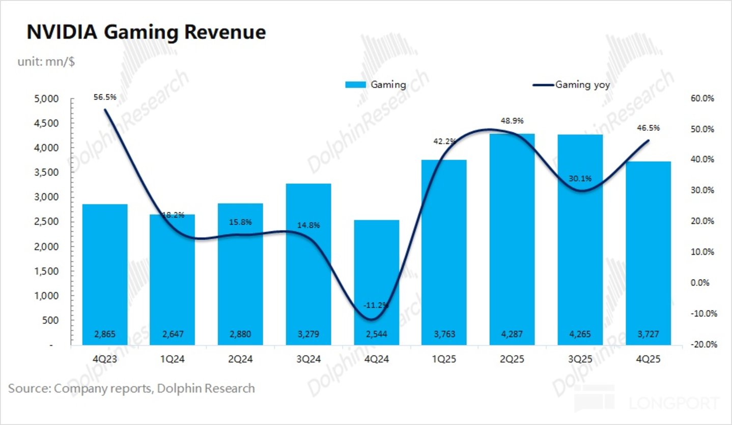 3.2 游戏业务:2026 财年第四季度英伟达游戏业务实现营收 37 亿美元,同比增长 46%,主要是受公司 RTX50 等系列产品的出货带动。游戏业务在公司整体收入中占比已经不足一成,公司当前业绩重心依然是数据重心业务。