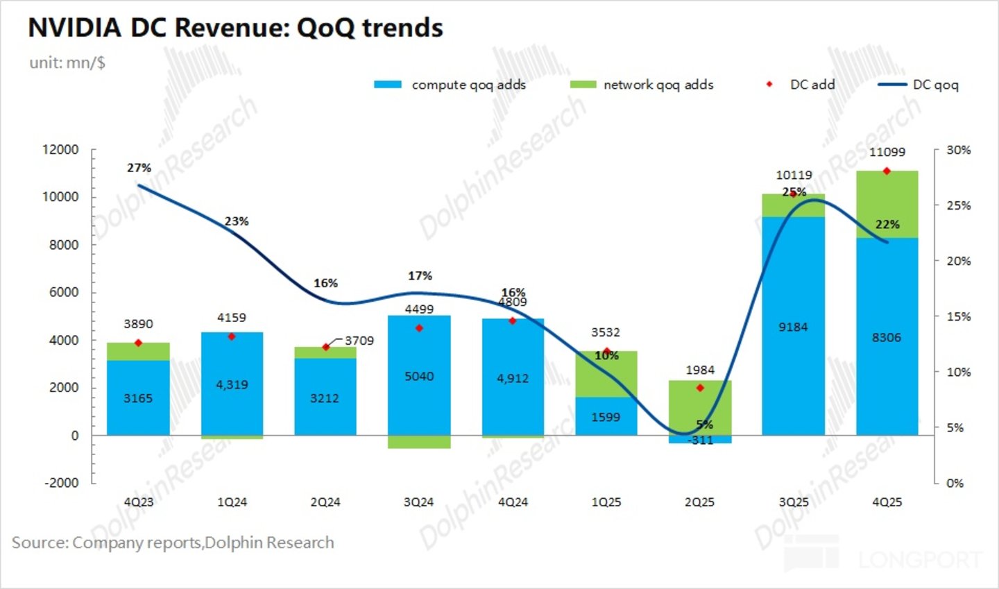 具体来看:①计算业务收入本季度为 513 亿美元,环比增加 83 亿美元,其中 B300 在本季度的加速量产贡献了最主要的增量;②网络业务收入本季度为 110 亿美元,环比增长 28 亿美元。