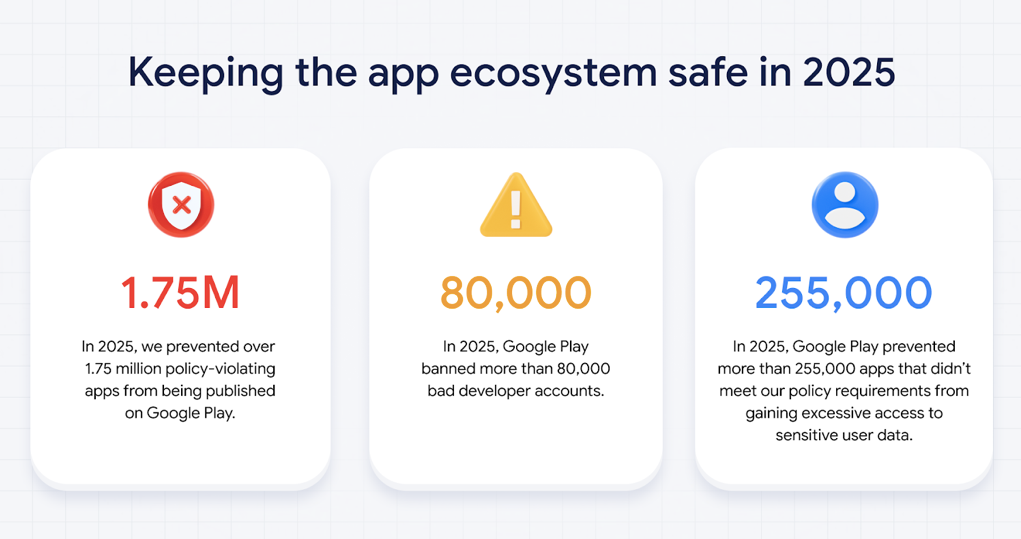 2025 年,Google Play 通过升级基于 AI 的多层用户保护机制,取得了令人瞩目的安全成效: