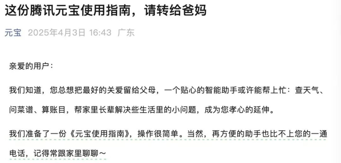 以腾讯为例,去年 4 月就发布了 《腾讯元宝使用指南》,详细介绍了元宝针对银发人群推出的字体调大、科普辟谣、聊天方言等适老化功能,腾讯还内测了专为中老年人设计的 AI 教学 App「时光易点」。