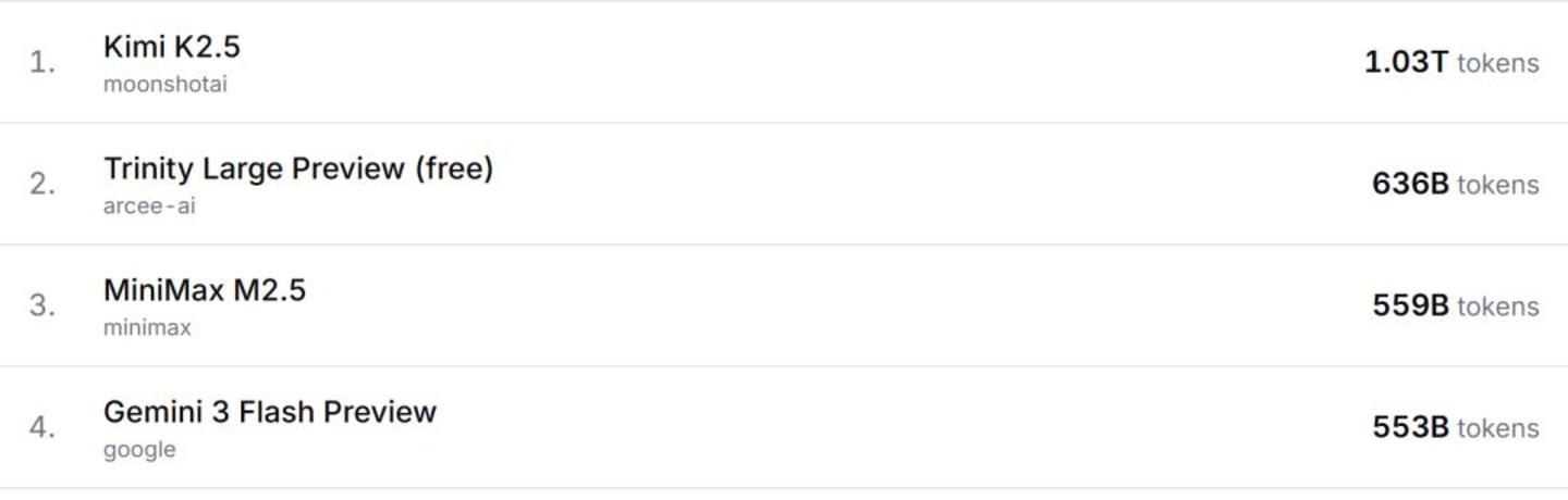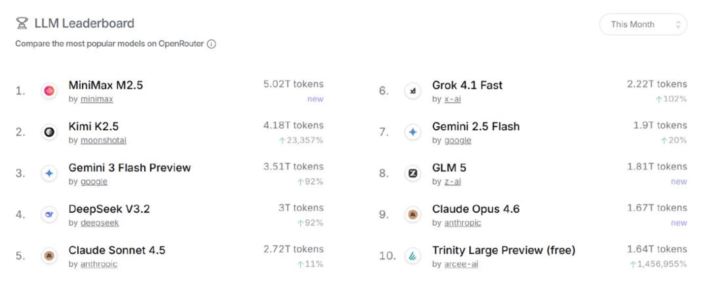 先从 API 说起,今年 2 月,Kimi K2.5 模型成为海外市场调用量增长极为明显的一家。OpenRouter 数据显示,该模型位于 Tokens 消耗第二的排名,环比增长 23357%。