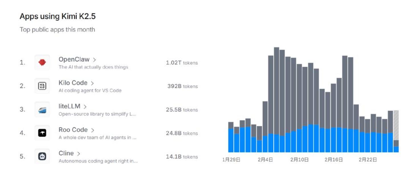 据 OpenRouter 数据显示,Kimi K2.5 的调用场景前二分别来自于 2 月爆火的 Agent 产品 「小龙虾」OpenClaw,和 AI 编程软件 Kilo Code。这两款产品,也是 OpenRouter 上 Tokens 消耗排名前二的产品。
