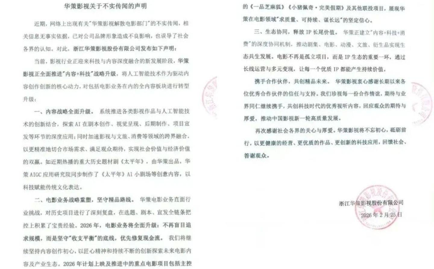 2 月 25 日,华策发布关于不实传闻的声明,否认解散电影部门,并表示未来将对全内容板块进行转型升级,电影板块转型的核心思路之一,是 2026 年不再盲目追求规模,而是坚守 「收支平衡」 的底线,优先修复现金流。同时,九派新闻报道,华策影视董秘办表示,未来华策会继续做电影业务,只是会更为谨慎地选择电影项目和题材。