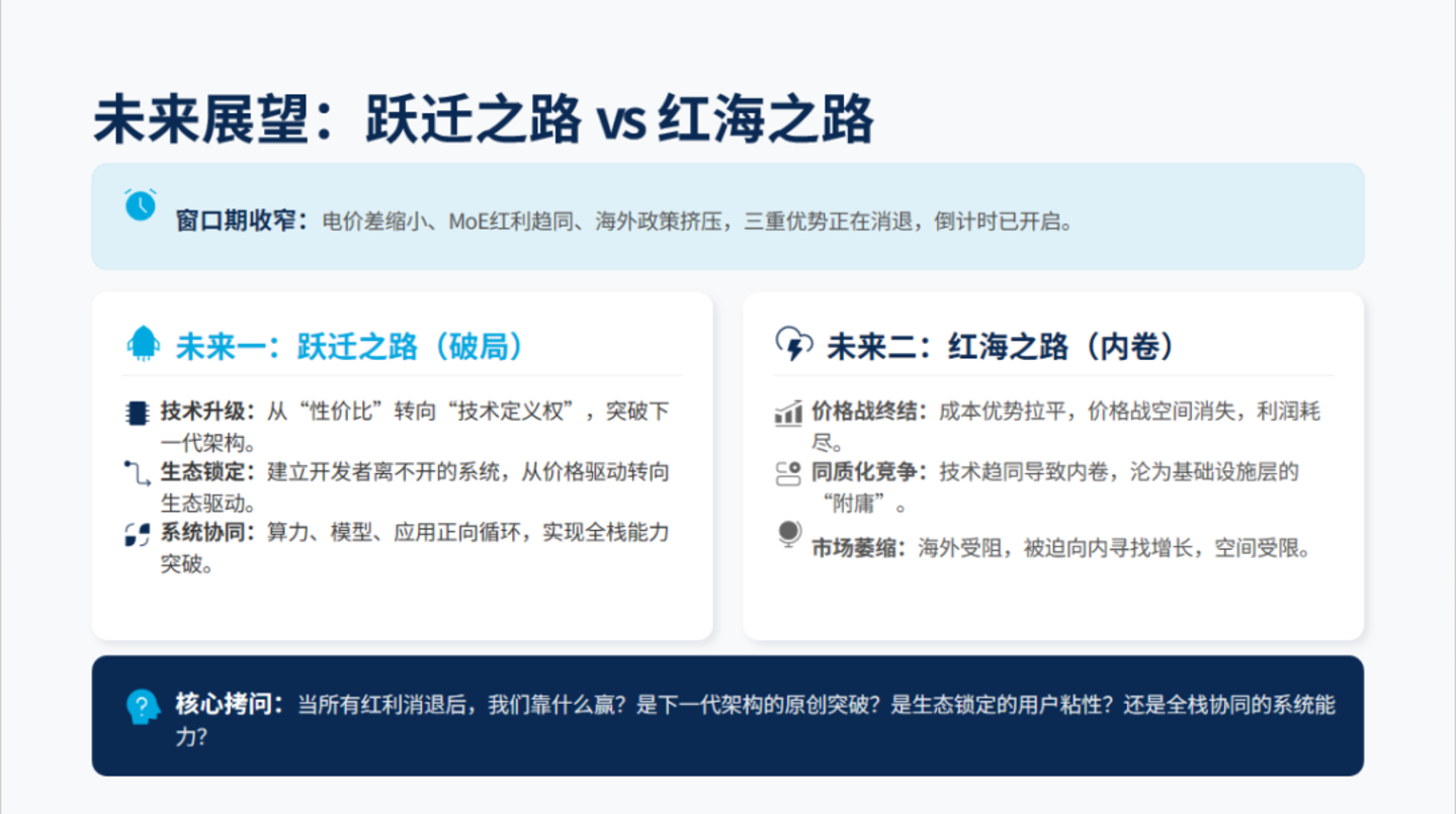 未来二:陷入红海。成本优势被拉平——当电价差缩小、MoE 趋同,价格战的空间消失。技术趋同导致同质化竞争——大家都在用类似的技术,拼的是谁更能 「卷」。海外市场受政策挤压——美国开发者市场萎缩,只能向内寻找增长。国内模型厂商在价格战中耗尽利润——最终沦为基础设施层的 「附庸」,为云厂商、算力厂商 「打工」。这是红海之路。易滑入,难挣脱。