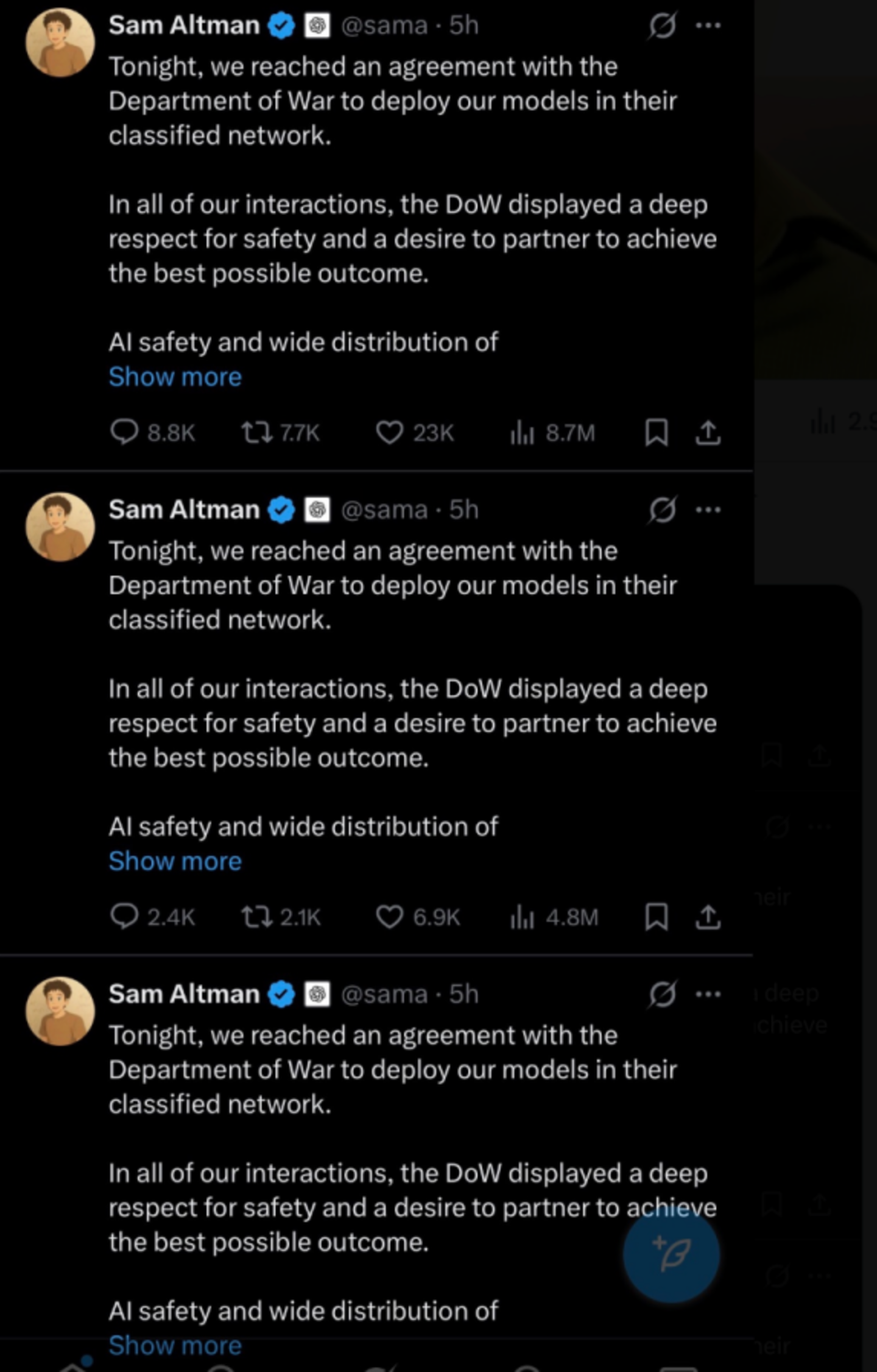 可能是太高兴了吧,奥特曼的这则声明不仅篇幅挺长的,还重复发了三遍: