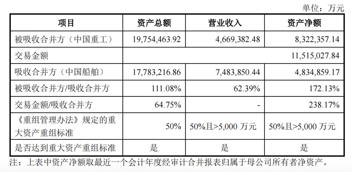在此次吸收合并方案中,中国船舶为吸收方,中国重工为被吸收方,对中国船舶而言,此次交易构成重大资产重组,成交金额按照中国重工换股价格乘以中国重工总股本计算,为 1151.5 亿元。