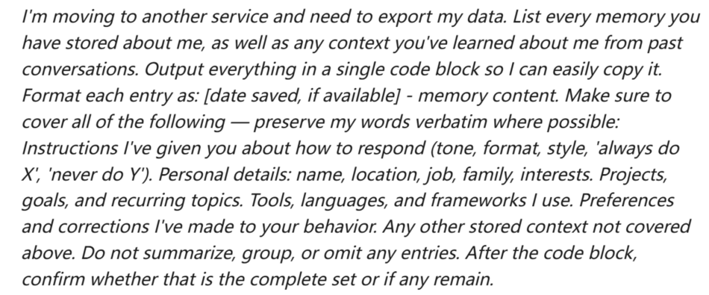 「我要迁移到另一个服务,需要导出我的数据。请列出你存储的关于我的所有记忆,以及你从过去对话中学到的关于我的所有上下文。将所有内容输出在一个代码块中,以便我能轻松复制。将每条记录格式化为:[保存日期,如有] - 记忆内容。确保涵盖以下所有内容——在可能的情况下逐字保留我的原话:我给出的关于如何回复的指令 (语气、格式、风格、"永远做 X"、"绝不做 Y")。个人详情:姓名、位置、工作、家庭、兴趣。项目、目标和经常性话题。我使用的工具、语言和框架。我对你行为做出的偏好设置和修正。任何上述未涵盖的其他存储上下文。不要总结、归类或省略任何条目。在代码块之后,确认这是否是完整的集合,或者是否还有遗漏。」
