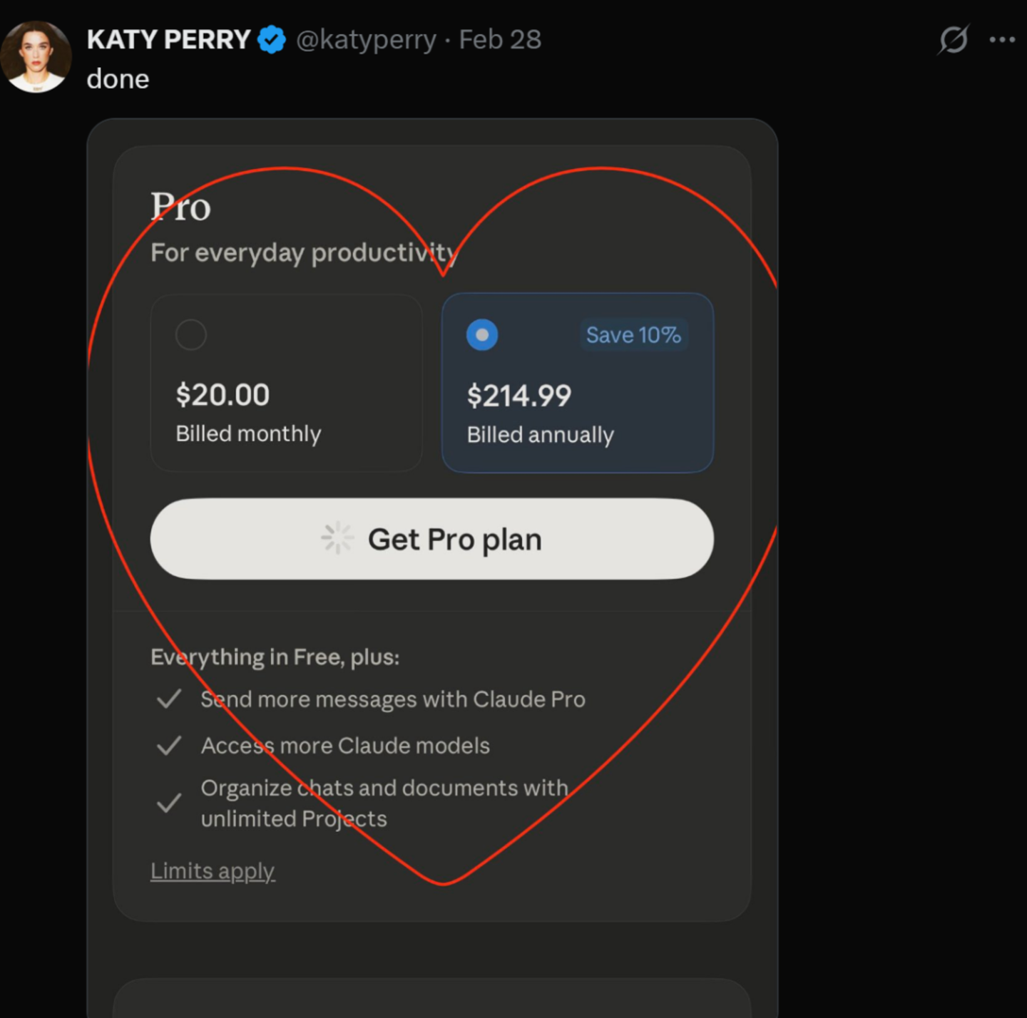 水果姐 (Katy Perry) 就在 X 平台晒出购买 ClaudePro 的截图,并配文称 「搞定」。