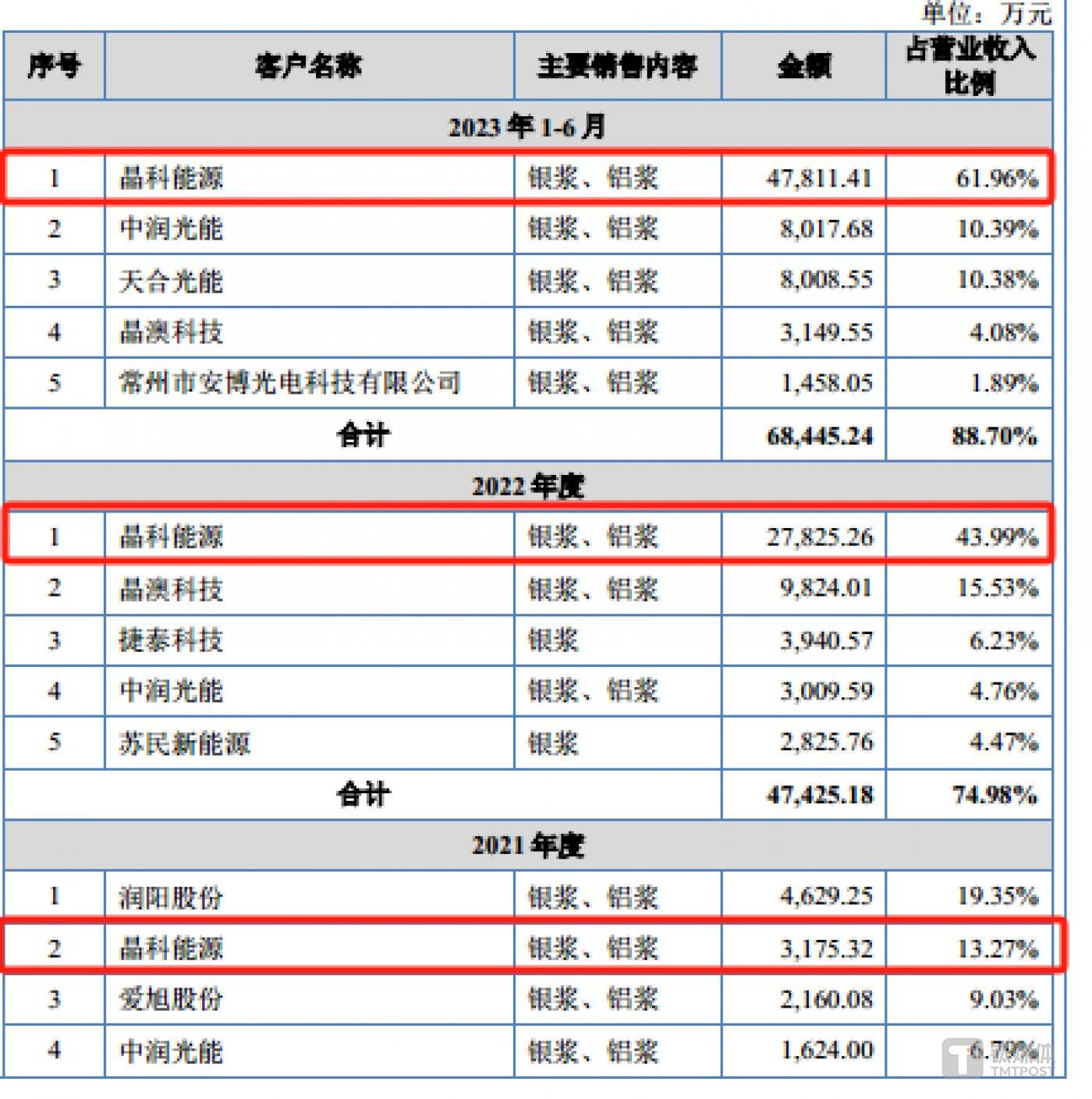 值得一提的是,在天盛股份的前五大客户名单中,国内头部的光伏公司晶科能源格外引人注目。报告期内,天盛股份向晶科能源产生的销售收入分别为 3715.08 万元、3175.32 万元、27825.26 万元、47811.41 万元,分别占当期营业收入的 12.39%、13.27%、43.99%、61.96%,并且在 2022 年和 2023 年上半年,销售金额暴增。为何晶科能源会突然大举向天盛股份采购?