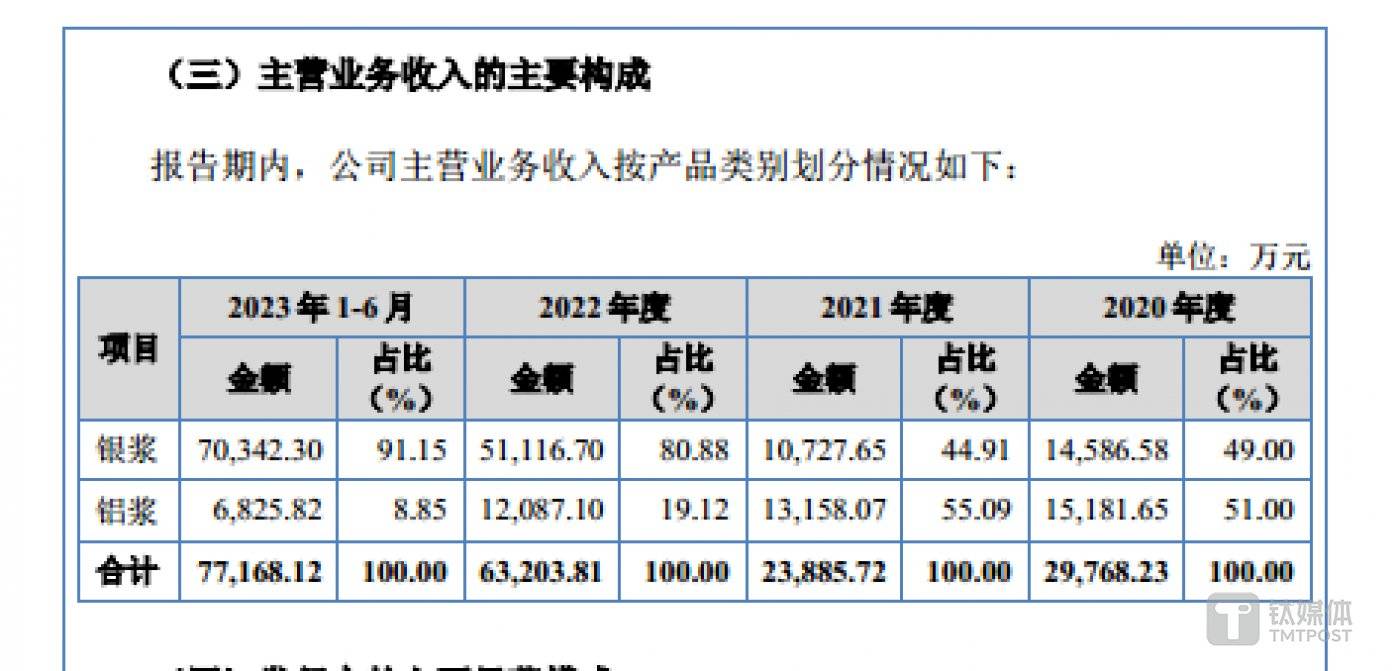 可见,2020 年还是天盛股份创收最高的铝浆,到了 2023 年上半年,其创收占比已不足 9%,而银浆的创收比例却屡创新高,2023 年上半年,这一比例已达到 91.15%。