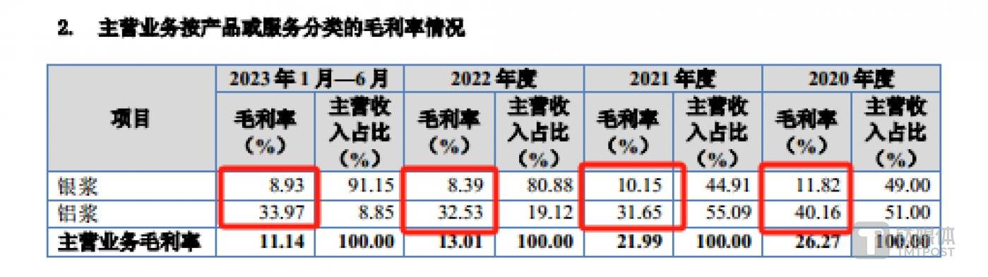 值得一提的是,正是由于 「抛弃」 铝浆业务,天盛股份的毛利率出现大幅且持续下滑。报告期内,天盛股份主营业务的毛利率分别为 26.27%、21.99%、13.01%、11.14%,其中 2022 年的毛利率同比下滑了近 9 个百分点。同时,银浆和铝浆的毛利率具体情况如下: